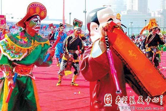 英歌舞是流行于潮汕地区的一种民间舞蹈,尤以潮阳和普宁地区最为有名,其中潮阳英歌舞和笛套音乐、剪纸一起被誉为潮阳民间文化的“三瑰宝”,普宁则有“英歌舞之乡”之称。英歌舞来源于《水浒》第六十六回“时迁火烧翠云楼,吴用智取大名府”的故事,当年梁山好汉化装成耍蛇的、踩高跷的、弄枪舞槌的,混进大名府,救出卢俊义。后人便把它编成英歌舞,自明代传承至今,已有 300多年的历史。