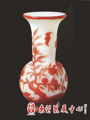 白地套红玻璃桃蝠纹瓶(清乾隆)高14厘米,口径6.2厘米,故宫博物院藏。