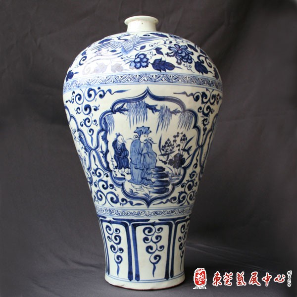元 高37.6厘米。小口外撇,短颈丰肩,胎白体重,施白釉,上绘青花纹饰,在肩部饰凤穿牡丹,腹部为主体纹饰,有四个菱形开光,内绘“四爱图”,即:王羲之爱兰,陶渊明爱菊,周茂叔爱莲,林和靖爱梅、鹤,人物形象生动,下层为一圈变体仰覆莲纹,三层纹饰以忍冬和锦带纹相隔。整体纹饰层次分明,繁而不乱,为进口青料,故色彩青翠艳丽。