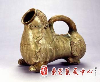 西晋,通高26.8厘米,长28.5厘米。青色釉,灰白色胎。体形似虎,作竖尾跪地长啸状。虎头高昂,嘴部张开成圆口形,器身部有线条纹及圆形戳印纹,象征虎的皮毛,四足屈跪腹下,虎尾上翘至颈部形成提梁。虎子出现于东汉,六朝时常用于随葬。其用途有两说:一说是盥洗用器,一说是夜壶。