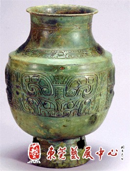 商,盘龙城出土,通高31厘米,腹径6.5厘米 ,口径14厘米。圆形直颈、折肩深腹,高圈足微向外撇。瓮身饰有精美的纹饰,其中颈部饰有三周凸弦纹,肩部饰有 3组夔纹,腹部饰有3组饕餮纹。饕餮是古代传说中一种凶恶的野兽,古代青铜器上常刻其头像作为装饰,有戒贪吃之意。圈足上装饰有2道凸弦纹与3个等距十字形镂孔。整个瓮体器壁较薄,色泽青绿,造型古朴典雅。为商代盛酒或贮水之器。盘龙城是我国迄今为止发现的保存最完整的商代古城之一,武汉城市的起源可以依此上溯到3500多年前的商代早期。这件兽面纹十字孔瓮可以称得上是武汉城市文明发薮的见证。属国家一级珍贵文物。
