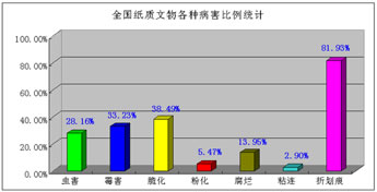 随着岁月的流逝,温度、湿度的波动、光的照射、有害气体的侵蚀、昆虫的蛀蚀、微生物的滋生,机械的磨损、撕破、鼠咬、火灾、水灾等都会造成纸张的变质和损坏。因此,研究纸张损坏的原因及其维护方法,延长其使用寿命,便成为纸质文物保护的一项迫切任务。