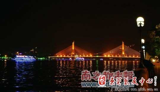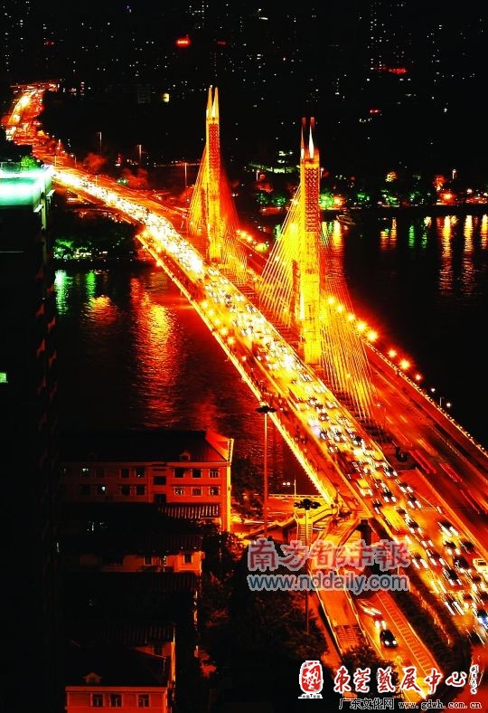 21时,只是城市夜生活的始点,但城市已安静了下来,没什么车,一路畅通无阻,一拐两拐,一下就从东湖公园上了海印桥。往前看,海印桥的万条斜拉钢丝由上而下呈放射状紧紧地拉住了整个桥身。海印桥流光溢彩地呈现在夜幕中,像两把巨大的竖琴,又像一艘双桅船在扬帆待航,越是靠近,金碧辉煌的感觉越是强烈,当你从这把竖琴的琴弦下驶过的时候,有如到了另一世界,似乎就是珠江里的水晶宫。即便我已是无数次在夜晚经过海印桥,但这样的心理体验却从不落空,而这样的体验,高低起伏,本身就已是乐章,在上面弹奏的,正是海印桥。
