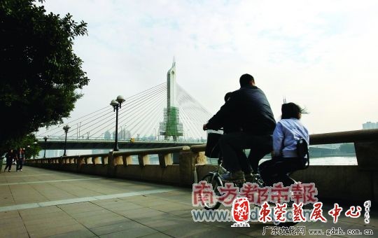 滨江路上骑自行车的父子仨,远处正是海印桥。海印桥已经成为广州一个代表符号。