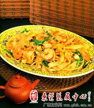 用米浆蒸成薄粉皮、再切成带状而成。盛行于广东、广西、海南,以广州市沙河出产的最著名,故名。因它是用白云山上的九龙泉水泡制的,所产的粉薄白透明,爽软韧筋兼备,炒、泡、拌食皆宜。近年来,沙河饭店将菜汁、红萝卜汁渗入粉浆中,制成彩色沙河粉,另有特色。
