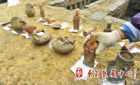 现场发掘人员陶荣说,其中一座古墓中还挖掘出一套陶制品,有陶井、陶灶、陶田、陶屋,组合在一起,生动地再现了当时人民的生活环境。