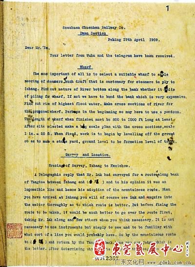 国家图书馆9月15日开幕的“东方的觉醒——纪念辛亥革命一百周年馆藏珍贵历史文献展”上,展出了国图珍藏的《川汉路信底函稿》一册,约300页。主要为詹天佑主持修筑川汉铁路期间的英文信底函稿,起自1909年4月,讫于1912年初,系詹天佑哲嗣詹文裕捐赠。其中最主要的收信者为颜德庆,其余有天津瑞记洋行范科尔巴、汉阳钢铁厂总办李维格等。主要内容有:关于川汉铁路宜万段沿江路线的选择,专用机车研制构想及川汉铁路山道机车选型,中国青年铁路工程师的培养以及对清政府强行实行铁路国有政策的不满等。