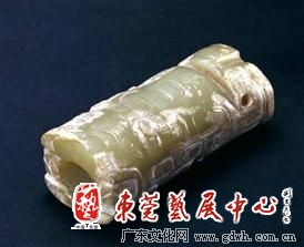 以青玉制,有白色沁,圆筒形,两端粗细不等。器表饰龙纹,其龙纹特点是“臣”字眼,并饰有重环纹、鳞纹等。商代的玉龙,由龙眼的变化可分为早、中、晚三个时期,早期的龙眼为方形或菱形,中、晚期为“臣”字形。重环纹和鳞纹直至西周中晚期才出现在青铜器上,因此本器上的这两种纹饰对于玉器和青铜器装饰纹样的比较研究有重要的意义。