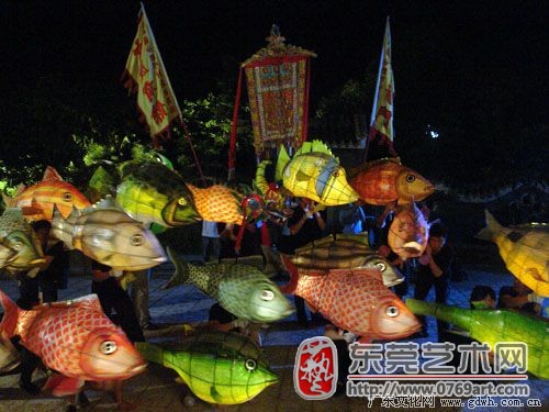 鱼灯是广府传统文化特色之一,用竹子、纸、塑料等制作,制成金鱼、鲤鱼、乌鱼、白兔、批皮橙等样式,时人称之为“百般生利”。沙湾群众于每年正月初一和八月十五有摆卖和扎作鱼灯的习惯。鱼灯多作小孩子节日娱乐玩具。那时灯档兴旺,买者络绎不绝,买了鱼灯回家的行人自然形成了断断续续的鱼灯队伍。