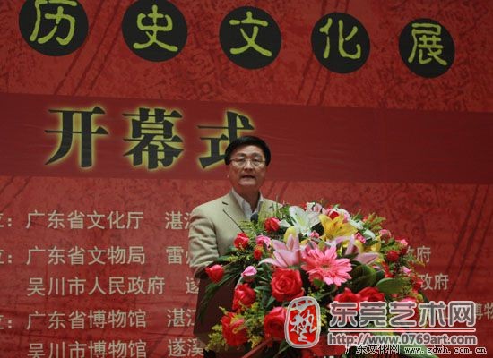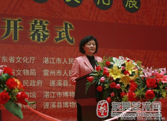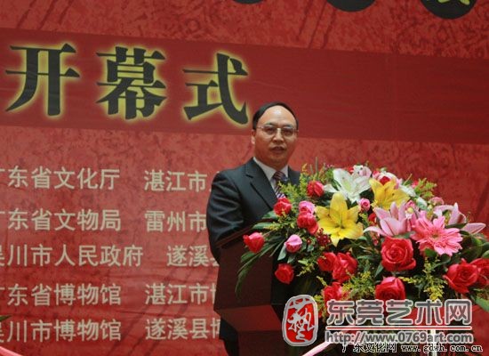 本次展览由省文化厅副厅长杜佐祥主持。在开幕式致辞中,省文化厅方健宏厅长表示,雷州文化源远流长、丰富厚重、特色鲜明,是岭南文化的重要组成和中华文化大观园的一朵奇葩。“雷州历史文化展”是在省委、省政府的高度重视,特别是汪洋书记的亲自倡导和关心下精心筹备的,是省文化厅积极贯彻落实党的十七届六中全会和全省文化改革发展工作会议精神的一项具体举措。省文化厅将加大对雷州半岛湛江文化的支持力度,打造雷州文化品牌,为粤西地区文化大发展,提升文化软实力。