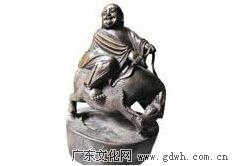 该竹雕作品雕刻着一位和尚骑牛的造型,作品中笑容可掬的和尚、低头耍脾气的牛儿都栩栩如生。由于时代久远,竹雕已变成古铜色,更显得古色古香。