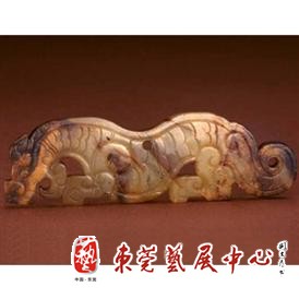 玉饰纹卧虎,春秋中期,长7.7cm,宽2.2cm,厚0.3cm。清宫旧藏。玉虎用青白色玉料,片状,有因埋藏而产生的褐色色变。虎伏状,整体呈“弓”字形,头部刻画精细,张口,上唇上卷与鼻相连,前后足皆呈卧状,尾大而上卷,虎身饰“人”字形阴线虎皮纹,四肢饰勾云纹。在春秋及战国早期墓葬中曾多次发现玉虎,其往往被成双使用,可能具有合符的功用。春秋时期的玉虎一般比此件更宽,且饰纹更复杂,而这件作品的造型较一般作品更为生动,形态准确。“人”字形虎皮纹继承了商、周玉器的某些装饰风格。作品中部有孔,虎尾及口部亦呈旋孔状,皆可穿绳悬挂。此玉虎可能是成组玉佩中用于中部的玉件,较一般玉虎更为珍贵。