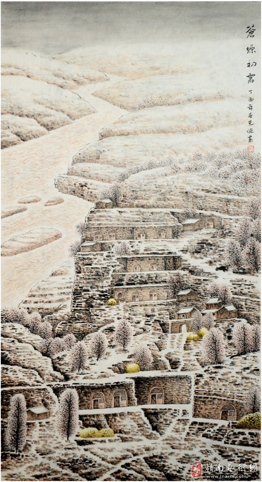 他以旺盛的艺术才情和对绘画独到的感悟,为观者展现了一个清新润爽、生机勃勃的诗意世界,给人以醇厚而隽永的美感享受。赵克俭最初从画素描、速写以及临摹一本残破的《芥子园画谱》做起。他钻研古今名迹,四处求师,孜孜矻矻,用自己的勤奋打开了艺术的大门。他的《古塬雪韵》将高原雪景描摹得自然生动。画家赋予画面以流动的美感,再现出积雪覆盖大地的真实情景。画面中的高原地形彰显出独特的氛围。在自然风光中,隐匿在山壑里的人家透露出画家所追求的归隐与闲适意境,令人心生向往。