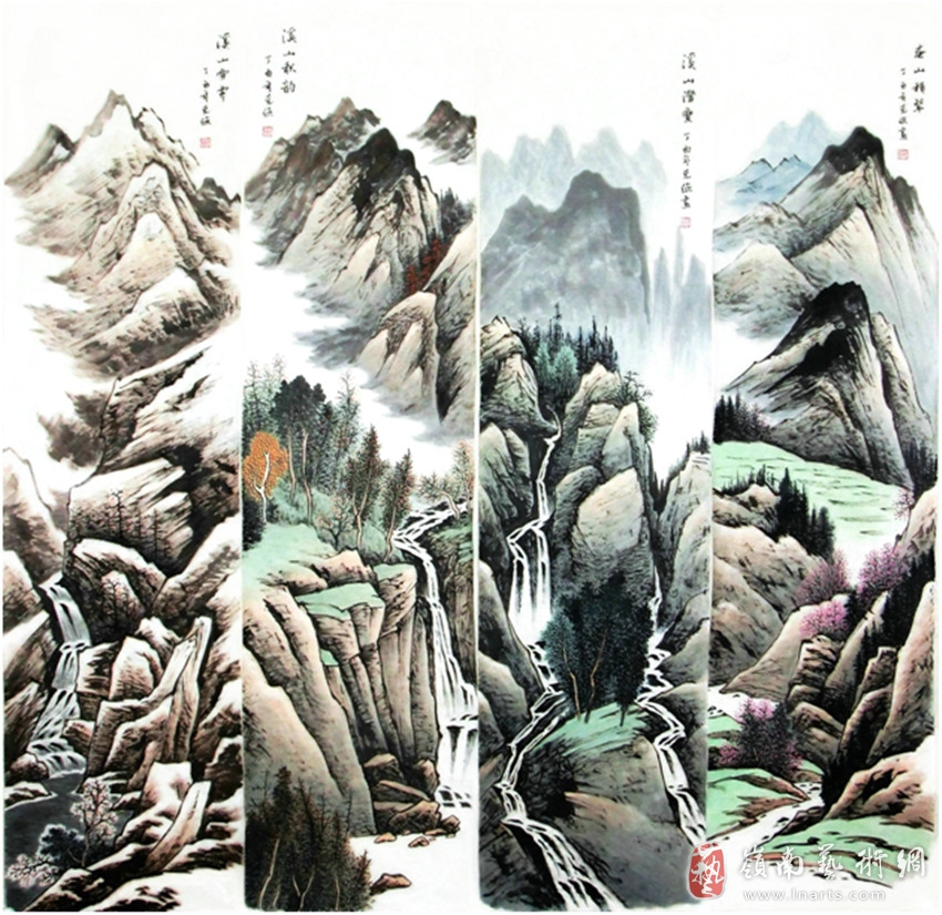作品《春山访友》是一幅以淡雅笔墨与细腻线条描绘出的青绿山水画。画家在作品中对山川的细腻呈现和对山水灵气的表现,凸显出山谷中的幽然风景。苍翠的古柏、湍急的瀑布,都有着浓浓的古典气息,显现出山水的宏大之气。在这幅作品中,画家十分注重对线条的展现—— 圆润明晰,层次感较强。画面中若隐若现的色彩点缀,营造出一种简淡雅逸的视觉氛围。画中被群山环绕的幽谷景象,让人感受到弥漫着笔墨清香的特殊意境。赵克俭的山水世界时常能带给观者一种纯净的恬适感,使处于生活压力中的我们远离喧嚣和纷扰。陡峭的山崖、苍劲的松柏、缓缓流动的浮云……一切都在一种“雅”的氛围中流动着。